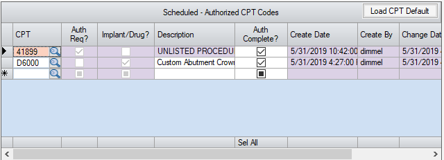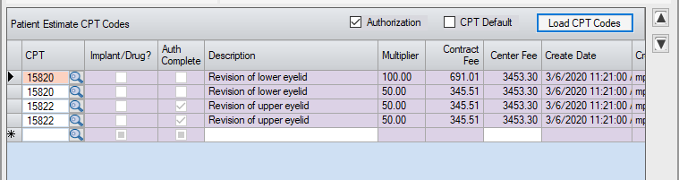 Any CPT codes entered in the Scheduled - Authorized CPT Codes grid can be pulled into the Patient Estimate by selecting the Authorized check box and the Load CPT Code function in that form.