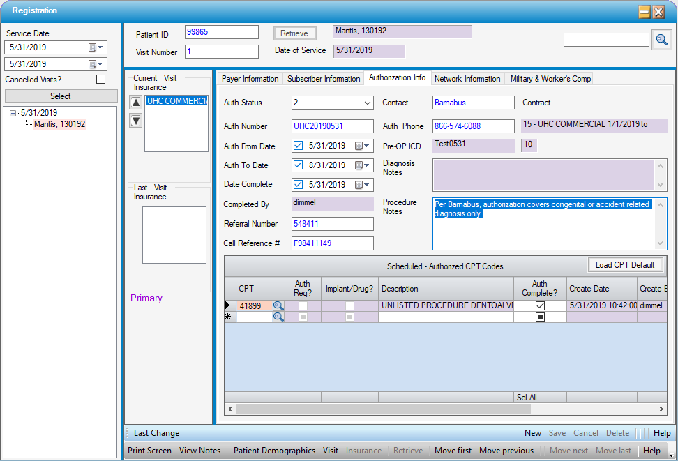 The purpose of the Authorization Info tab is to minimize claim denials by ensuring that all scheduled procedures that require an authorization have received confirmation that authorization has been approved by the payer prior to performing the procedure. In addition to this function, codes entered here can be pulled into the Patient Estimator for accurate profiling, and this tab also interfaces with the CPT codes entered in charge entry to insure that the codes authorized match the codes billed so that claims can be held and retro-authorizations obtained prior to billing when they do not.