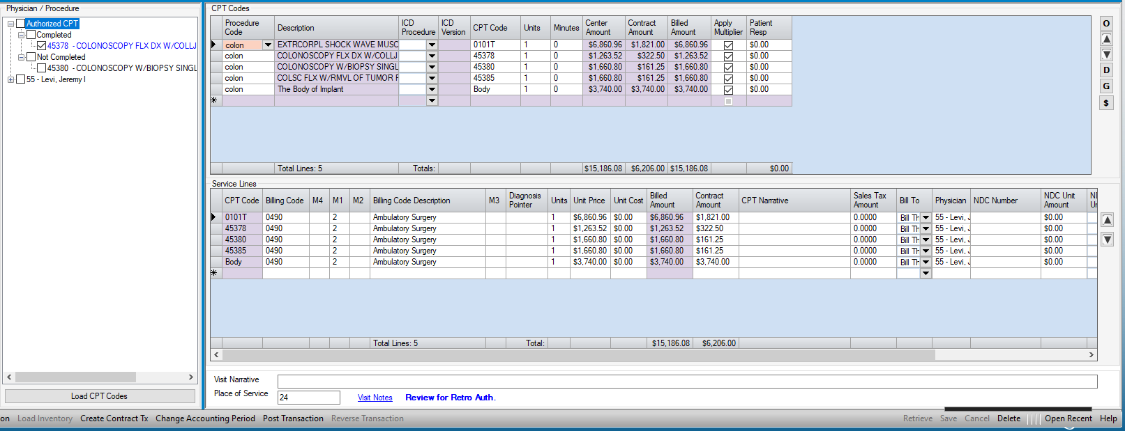 - If CPT Codes were entered on the Authorization Information tab on the Appointment those codes will populate automatically but can be edited.