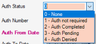 Auth Status will default to 0 - None. This status indicates that no action has been taken to confirm whether or not authorization is required or has been obtained. This status will prompt a Workflow Task if Primary Insurance Not Authorized is flagged for Inclusion in Workflow Configuration.