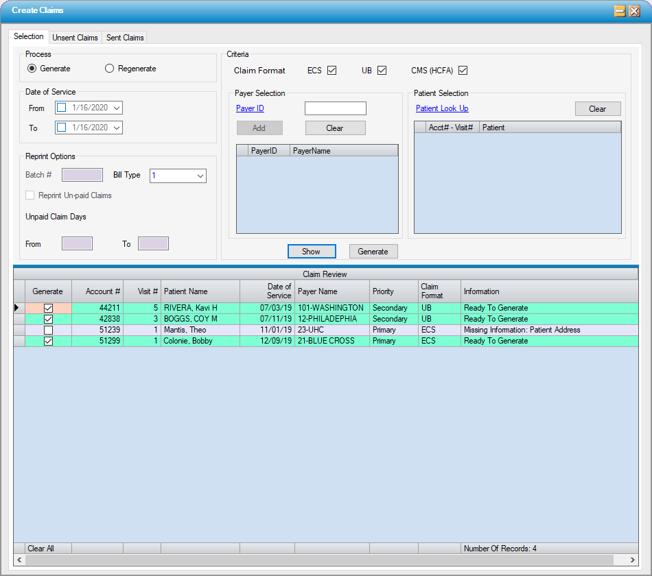 HST Practice Management Claims Generation was designed so that users could generate all eligible claims in one step. ECS, CMS, and UB claims are generated simultaneously and then divided into batches based upon the format for transmission and/or printing.