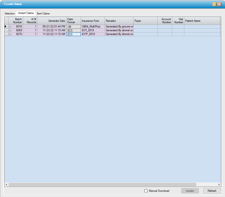 - Go to Unsent Claims to print and/or transmit the claims generated following the same steps utilized when Generating claims.