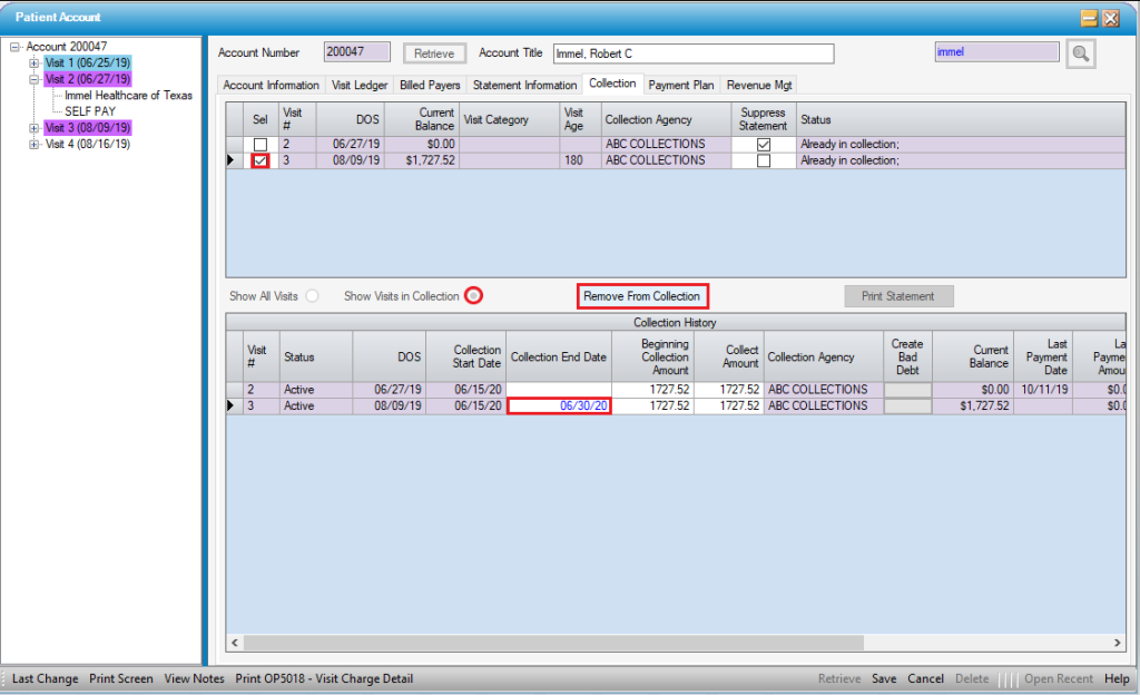 NOTE: When a visit is removed from Collection, the purple highlighting in the tree view will be removed. To retain the highlighting yet still document that a collection balance has been paid, enter the Collection End Date and update the Collect Amount, but do not remove the visit from Collections.