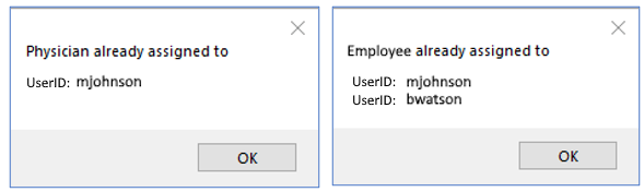 Validation for Physicians linked to User Profile records is already in place. However, the message will now indicate to which User ID the Physician is linked.