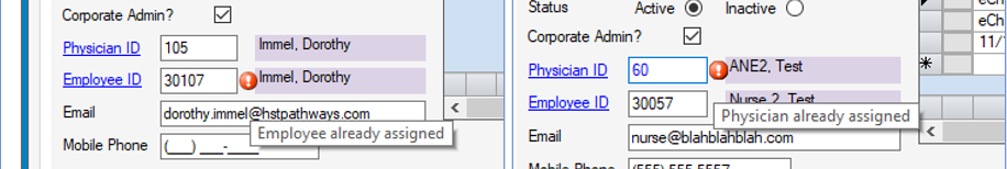 PLEASE NOTE: This validation will only occur when either the Physician or the Employee field is changed. If the User Profile record is existing with a duplicated Linked ID, and some other field is changed, there will not be a validation for either of these fields. Please use the User Profile Data Export to determine if there are any duplicated linked records. See the Before You Begin help file for directions on finding duplicated linked records.