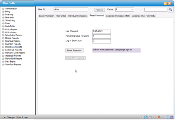 This button is only enabled if MFA is enabled at a center this user has access to and their account is locked. When an account is not locked, the following message will display next to the button: User is not locked out. When the account is locked the message next to the button displays: Account is locked. When this button is clicked, the account is reset and the message will display The Account has been reset. This option can be accessed by those users who have permission to Reset Passwords. The hover message for this button reads Reset MFA Lockout Only. This option does not affect user passwords.