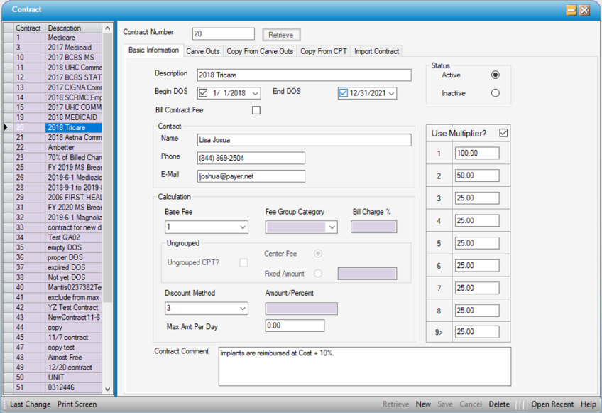 - Amount/Percent box will be open to enter percentage of markup. If %Markup is selected, be aware that this markup is added to the base fee. If the contract specifies 150% of Medicare Fee, for instance, the Markup should be 50%, to add an additional 50 percent to the existing base (Medicare) fee.