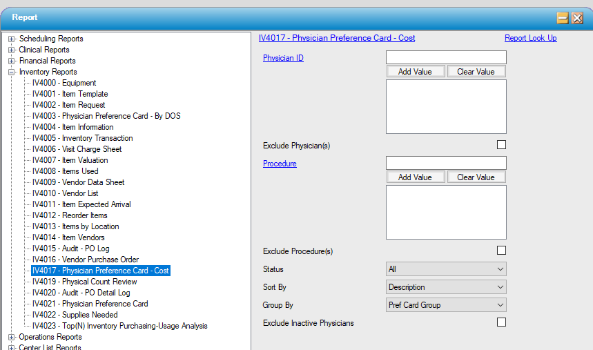 - Sorting and Grouping on this report are based on the item pick list from the preference card.