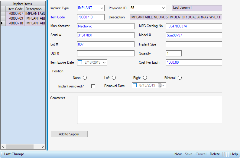 to add to Supply Used tab. (Add to Supply function will not be available for selection if implant was entered without an Item Code.)