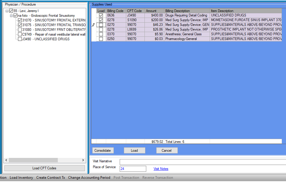 Load Inventory is a function that allows implants, drugs, and extraordinary supplies entered in theSupply Used tab of Case History to be loaded directly into the Charge Entry form. The advantage of utilizing this process is that the quantity, unit cost, and unit price are also loaded, minimizing manual data entry and reducing the margin for error.