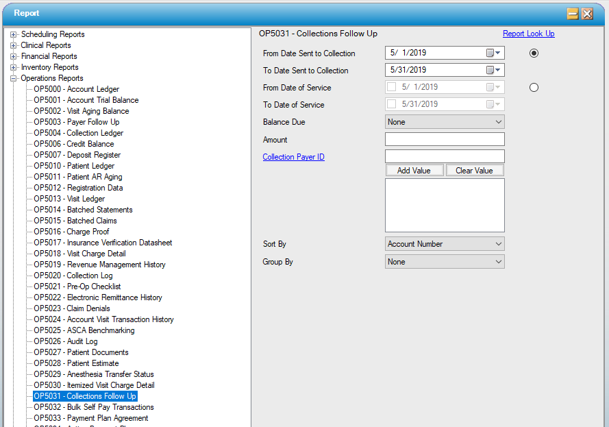 This report lists those visits that are in collections and enables follow up with the collection agency. Individual visits can be turned over to collections in the Patient Account on the Collection tab.