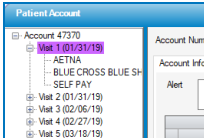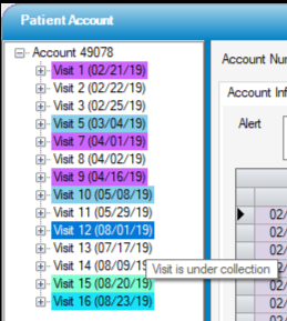 The Tree View on the left displays all visits associated with an Account. Visits may be color coded to indicate cancellation or collection status (hover messages will indicate status as well):