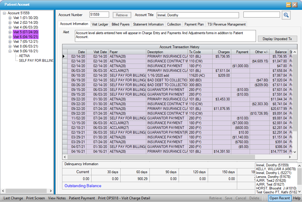 Patient Account is used to review patient account specifics (i.e.: date the account was opened, financial aging of the account, originating charges and billings, receipt of payments and date of adjustments, and statement information), process Patient Payments via the Waystar Collection Terminal, set up Payment Plans, assign visits to Revenue Management, and/or Assign visits to Collections. View and add notes regarding the account from this form as well.