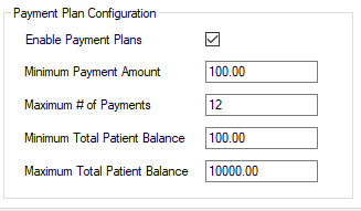 The Enable Payment Plans check box must be selected in Administration > Configuration > Center Configuration > Center tab in order for this tab to be available for utilization. At that time, center administration can also set up a minimum payment amount, maximum number of payments, minimum total patient balance (starting balance), and maximum total patient balance.