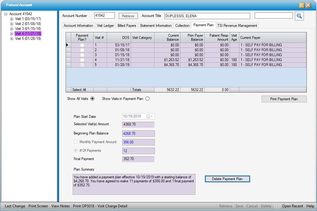 When the Payment Plan tab is opened in the Patient Account, the tree view on the left will display all the visits for the account entered. Note in the example above that the colors in the tree view do indicate that Visit 4 is in Collections. Consequently, only Visit 5 was selected for the current Payment Plan.