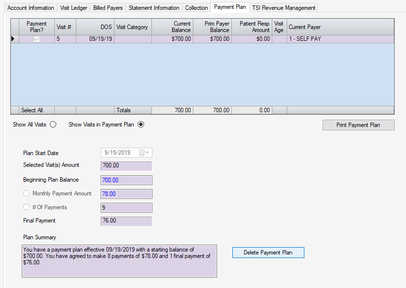 once the plan has been established. To remove a payment plan, select this function. To make changes to an existing payment plan (adding new visits, editing the Monthly Payment Amount, editing the # of Payments), the existing plan must be deleted and a new plan established.