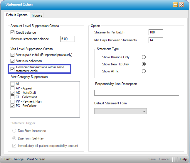 NOTE: There is a setting in Statement Options that will prevent transactions that have been reversed from appearing on patient statements, so long as the reversal was performed within the same statement cycle as the original transaction.